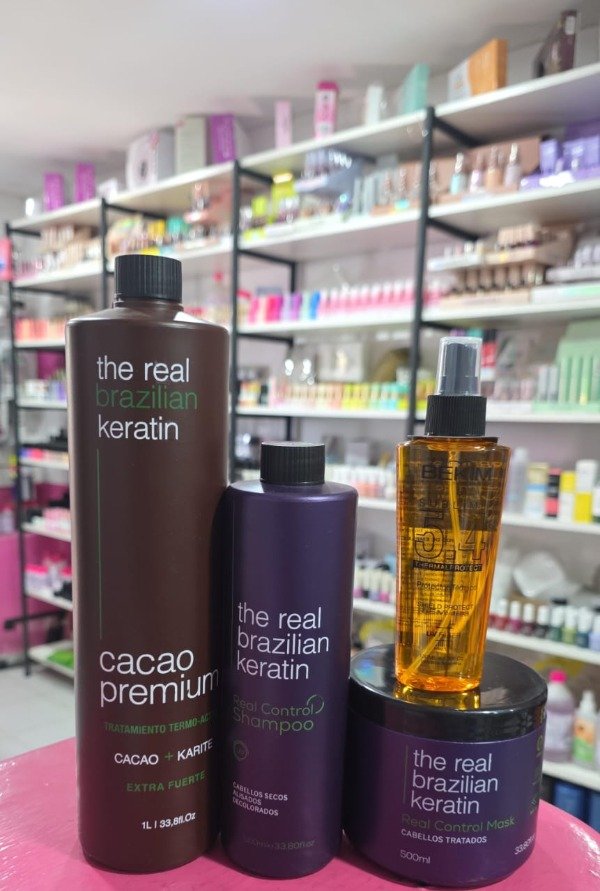 KIT IDEAL PARA RELAIZAR TUS TRABAJOS DE ALISADOS, CONTIENE: ALISADO DE CACAO - SHAMPOO SIN SAL PARA SU POSTERIOR MANTENIMIENTO Y MÁSCARA CONTROL TAMBIÉN PARA CUIDAR TU ALISADO Y POR ÚLTIMO LA JOYITA, EL PROTECTOR TÉRMICO.